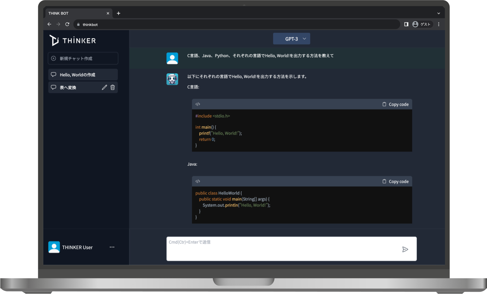 しかし、THINK BOTは入力データを学習データとして使われないため、安全にChatGPTを使用することができます。